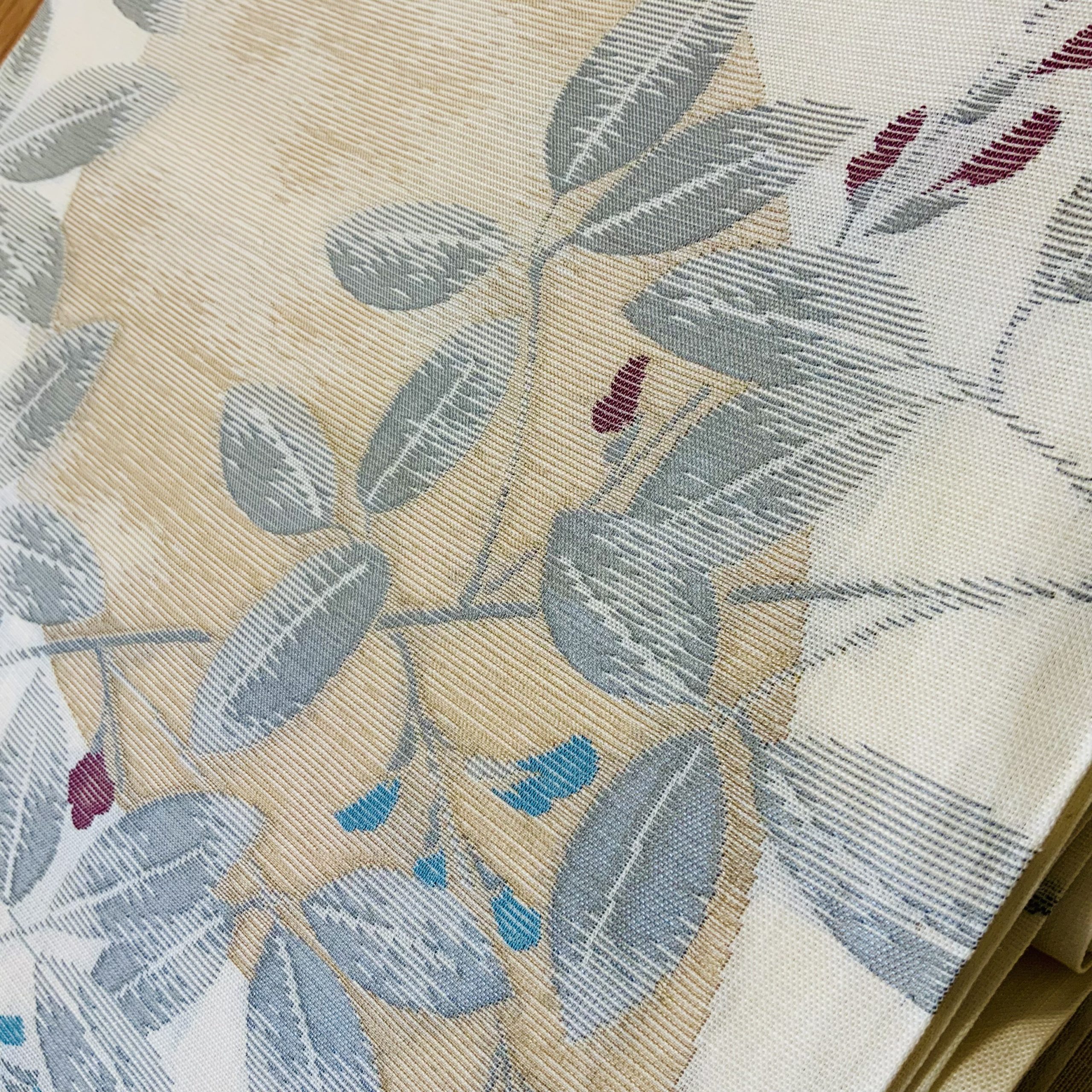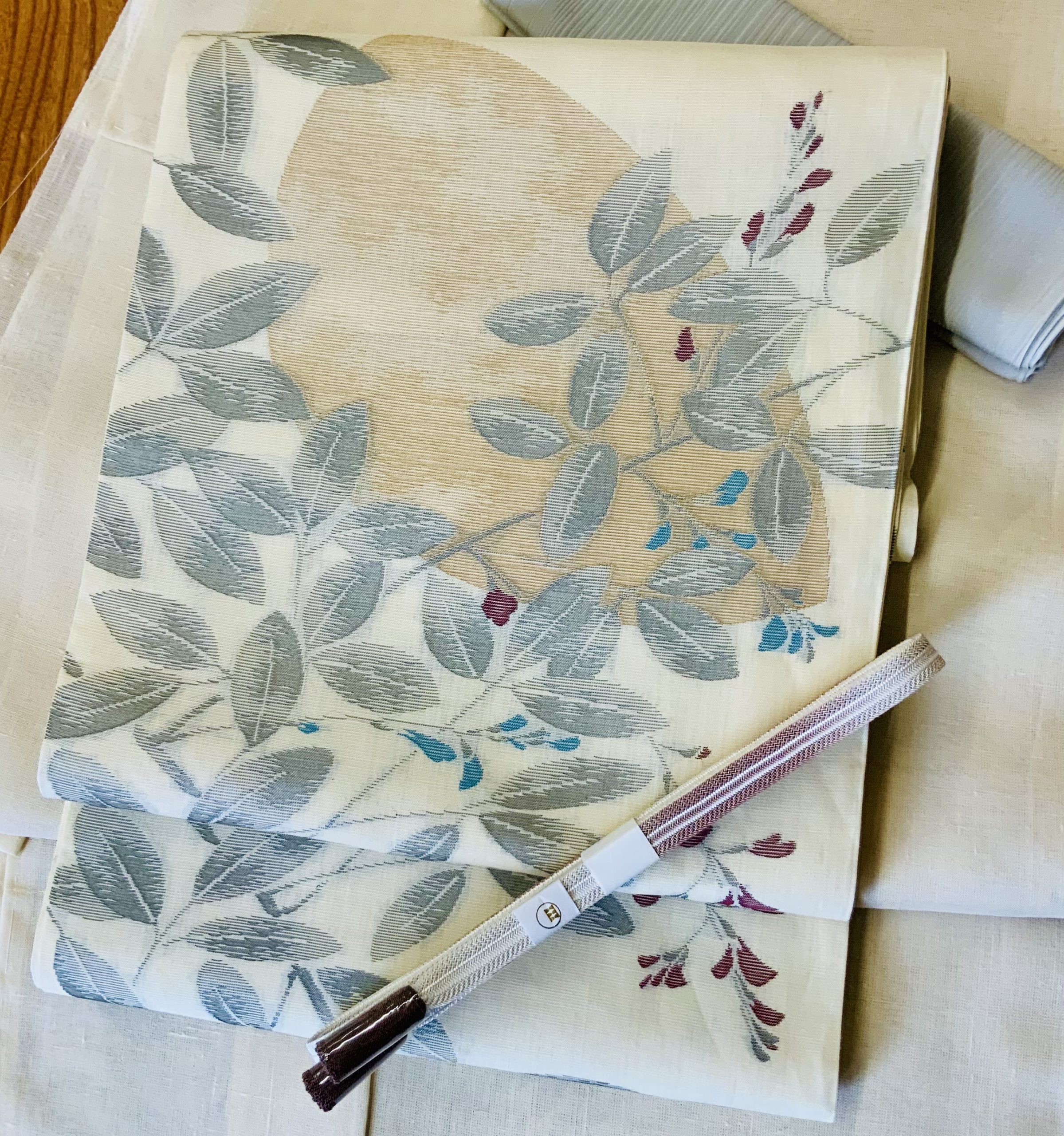 合わせた帯は、月光に照らされた萩の葉を思わせる袋帯。生成り地に浮かぶ灰青や紅、青の彩りが幻想的に映え、月の丸文が静かな気品を漂わせます。麻地ならではの透け感と織の美しさが、装い全体に奥行きを与えてくれます。