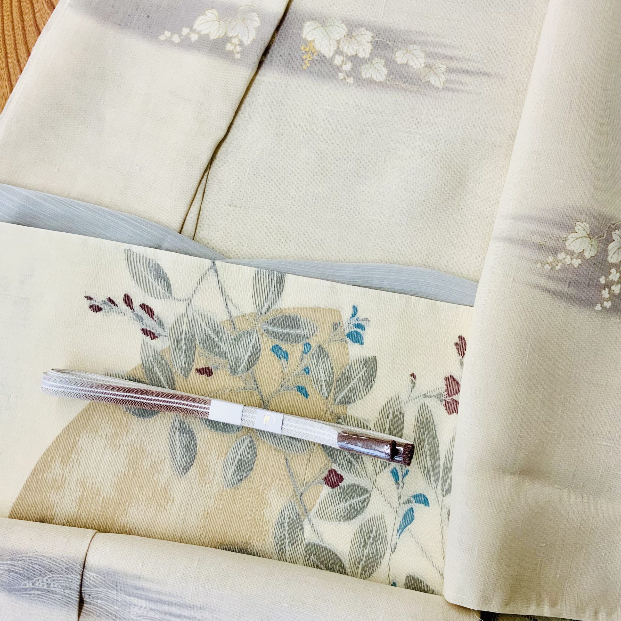 【夏訪問着:京手描友禅 刷毛暈し蔦に枝 × 夏麻袋帯:萩に月】