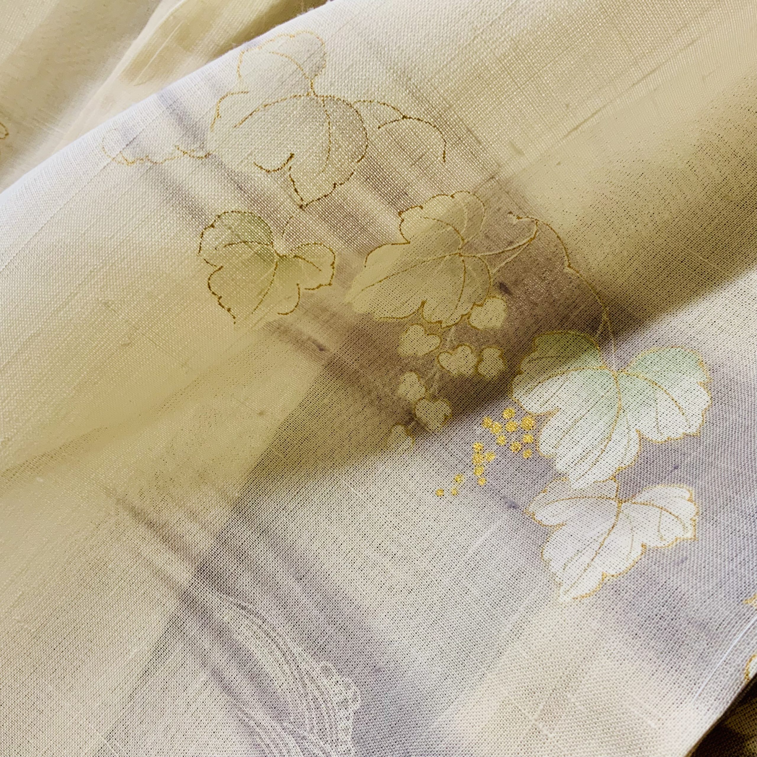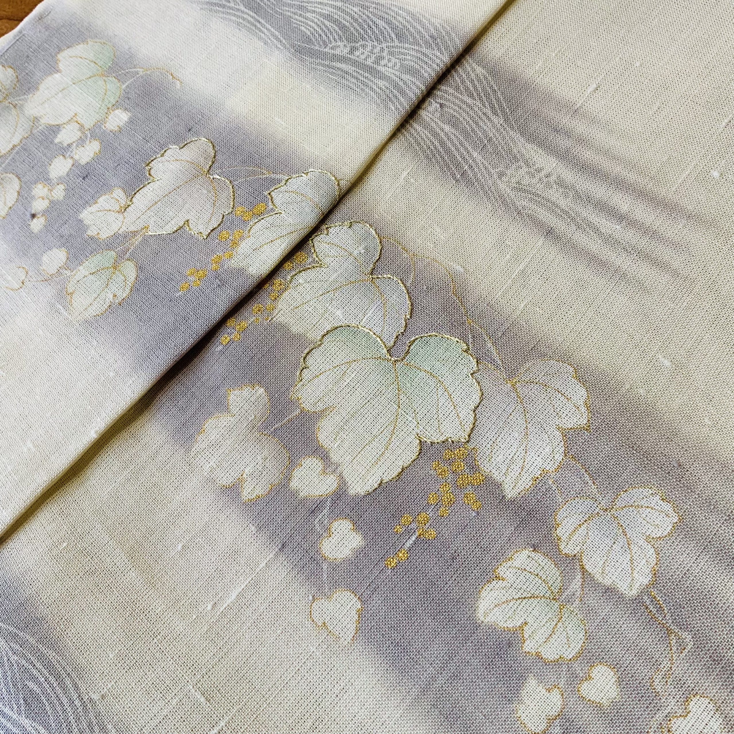 淡い生成り地にやさしく刷毛で暈された地色。その上に繊細に描かれた蔦の葉と枝の文様が、まるで風にそよぐような軽やかさを添えます。京都の職人による手描き友禅ならではの表情が、夏の訪問着にふさわしい上質感を醸し出しています。