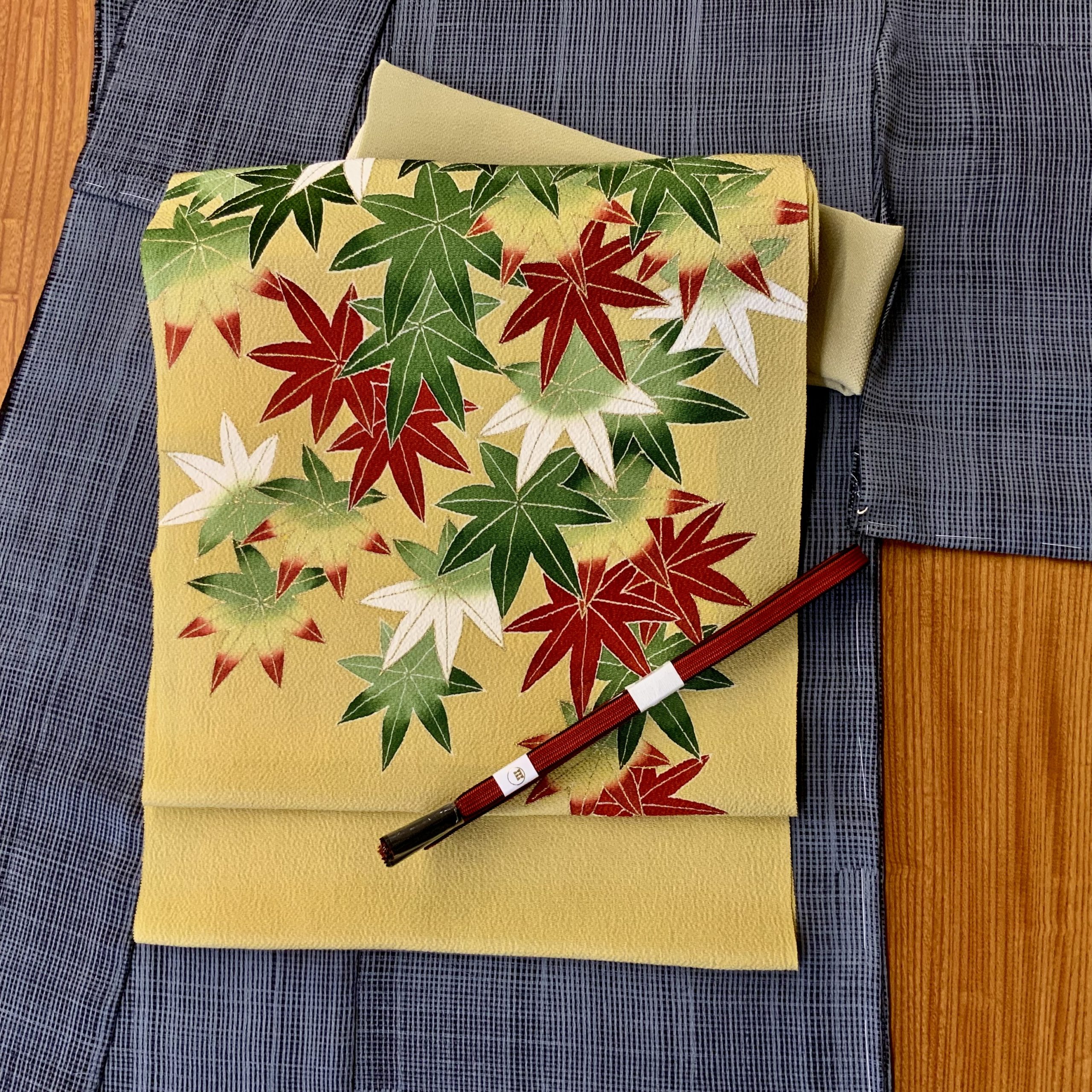 淡い黄色地に赤・緑・白の紅葉が散りばめられた帯は、季節の移ろいを感じさせる一枚。繊細な染めと立体感のあるちりめん地が、見る人の心を惹きつけます。