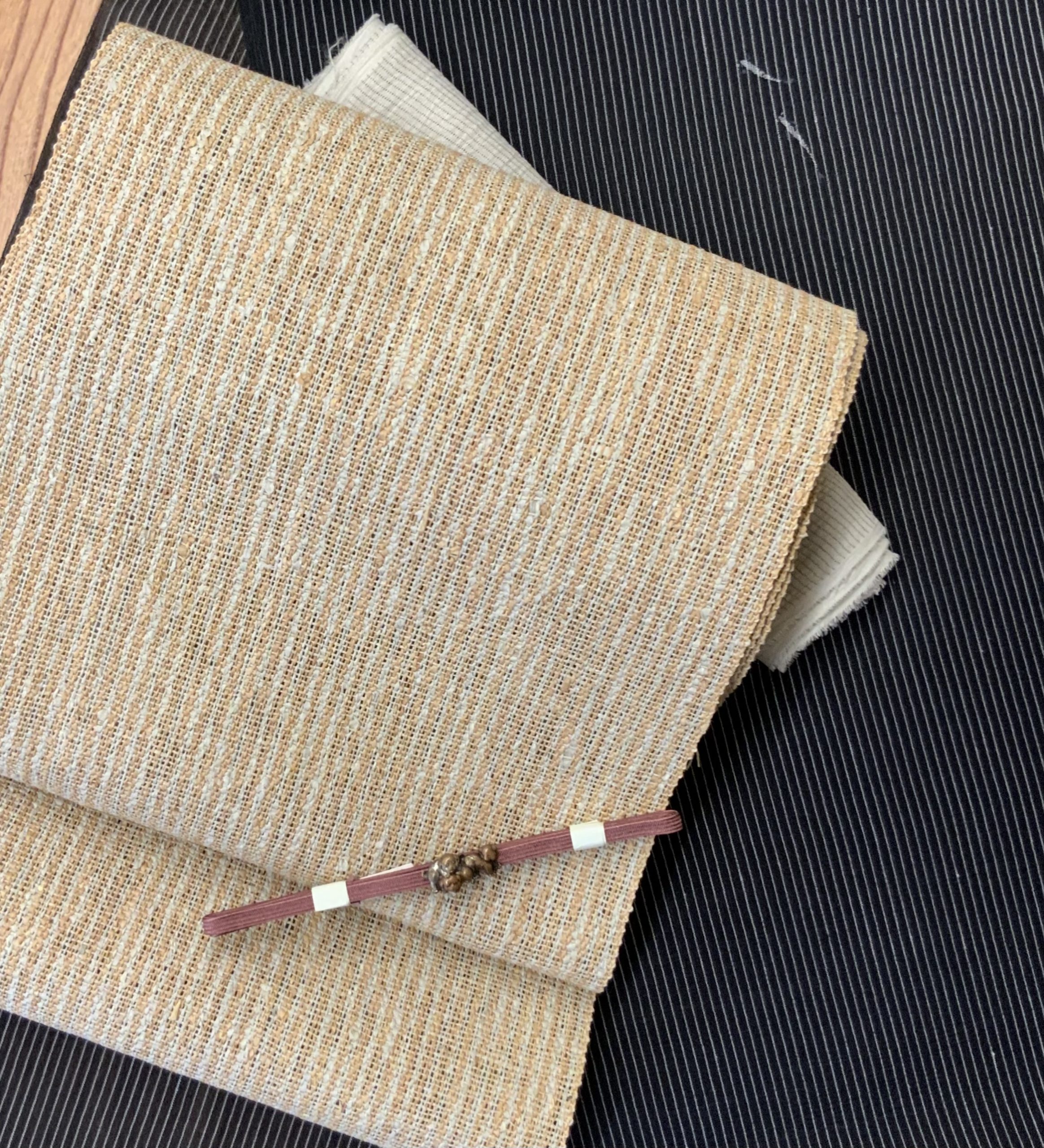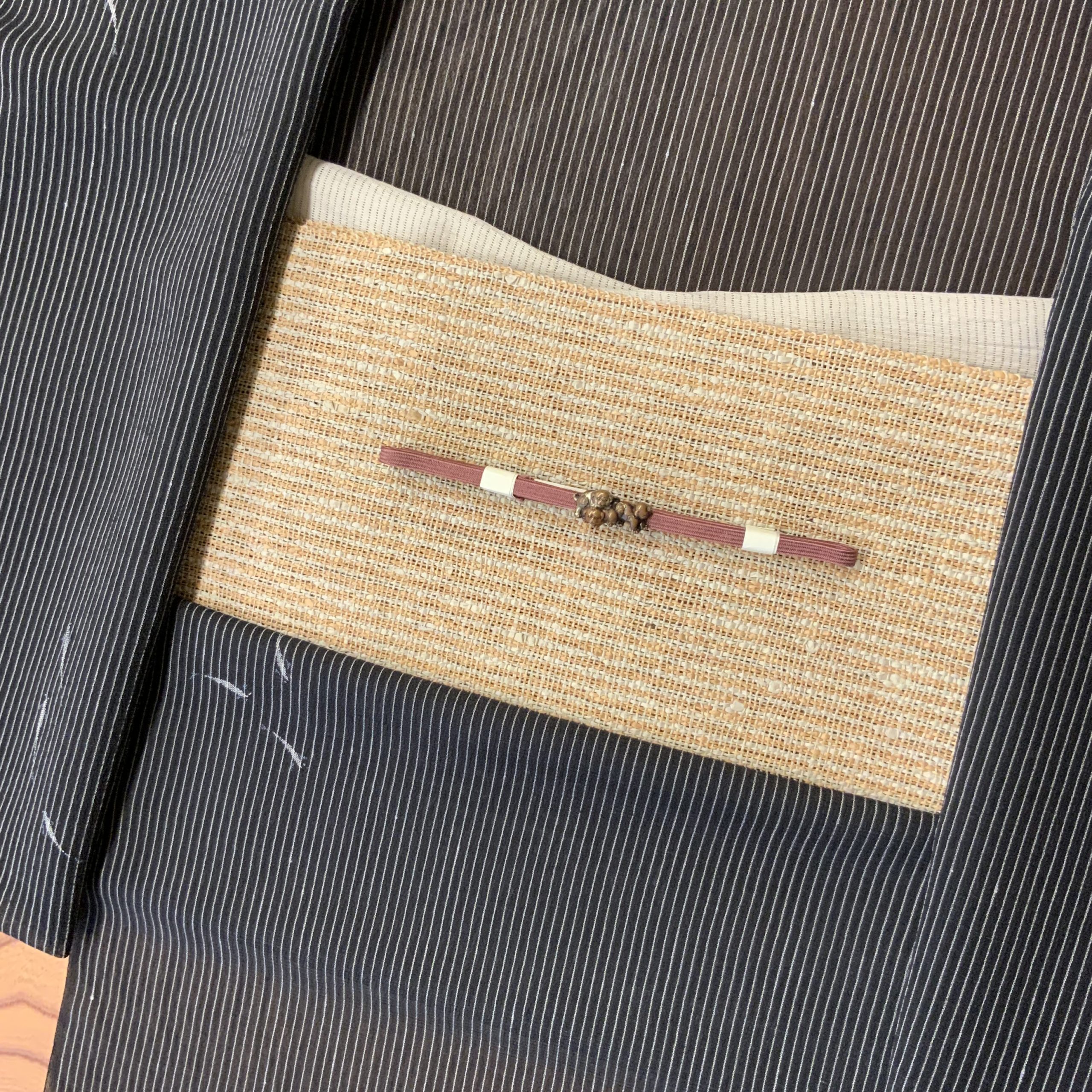合わせたのは、素朴ながら深みのある柿茶の松煙染で織られた諸紙布の八寸帯。生成りの地色に浮かぶ細やかな格子が、涼やかな印象と手仕事のぬくもりを添えています。