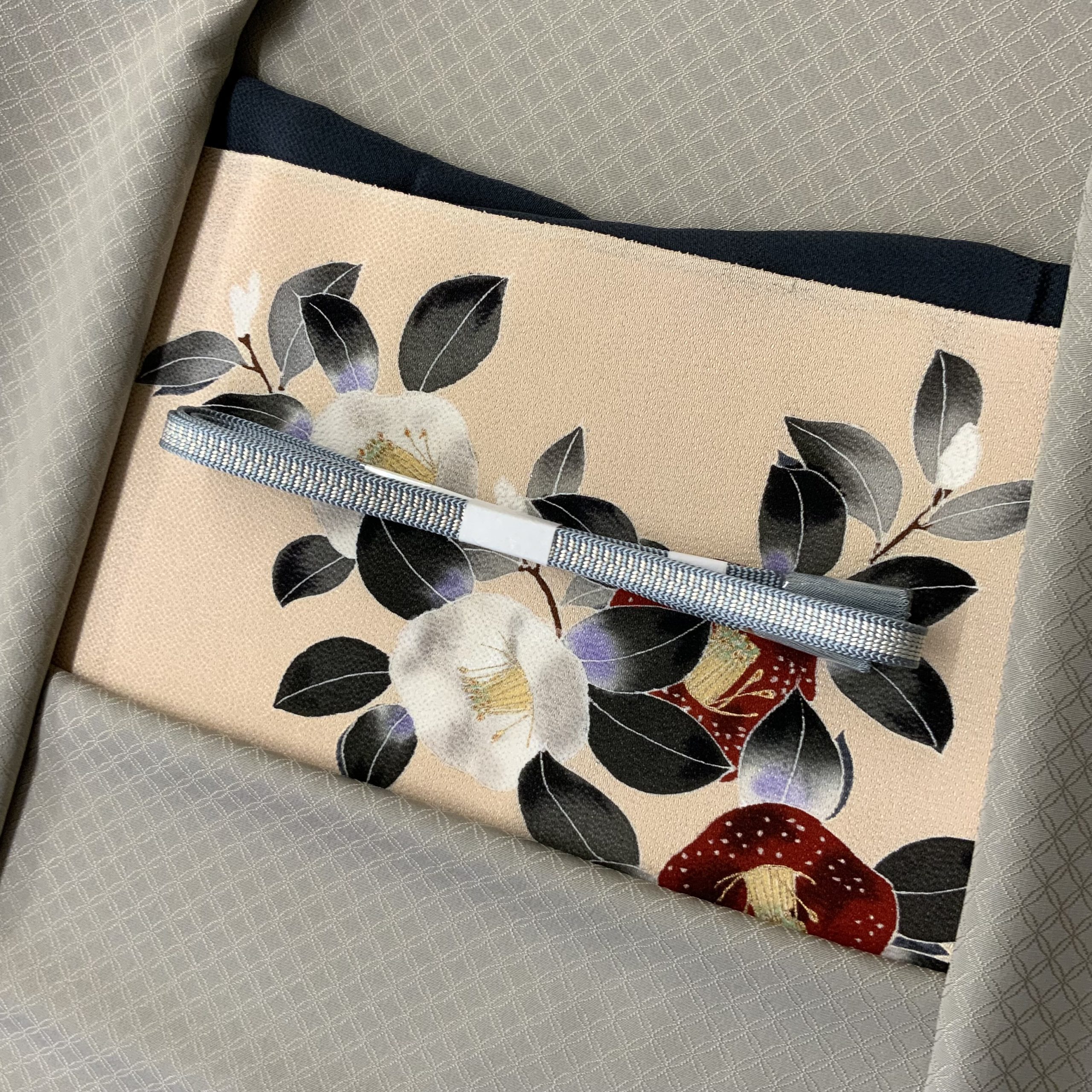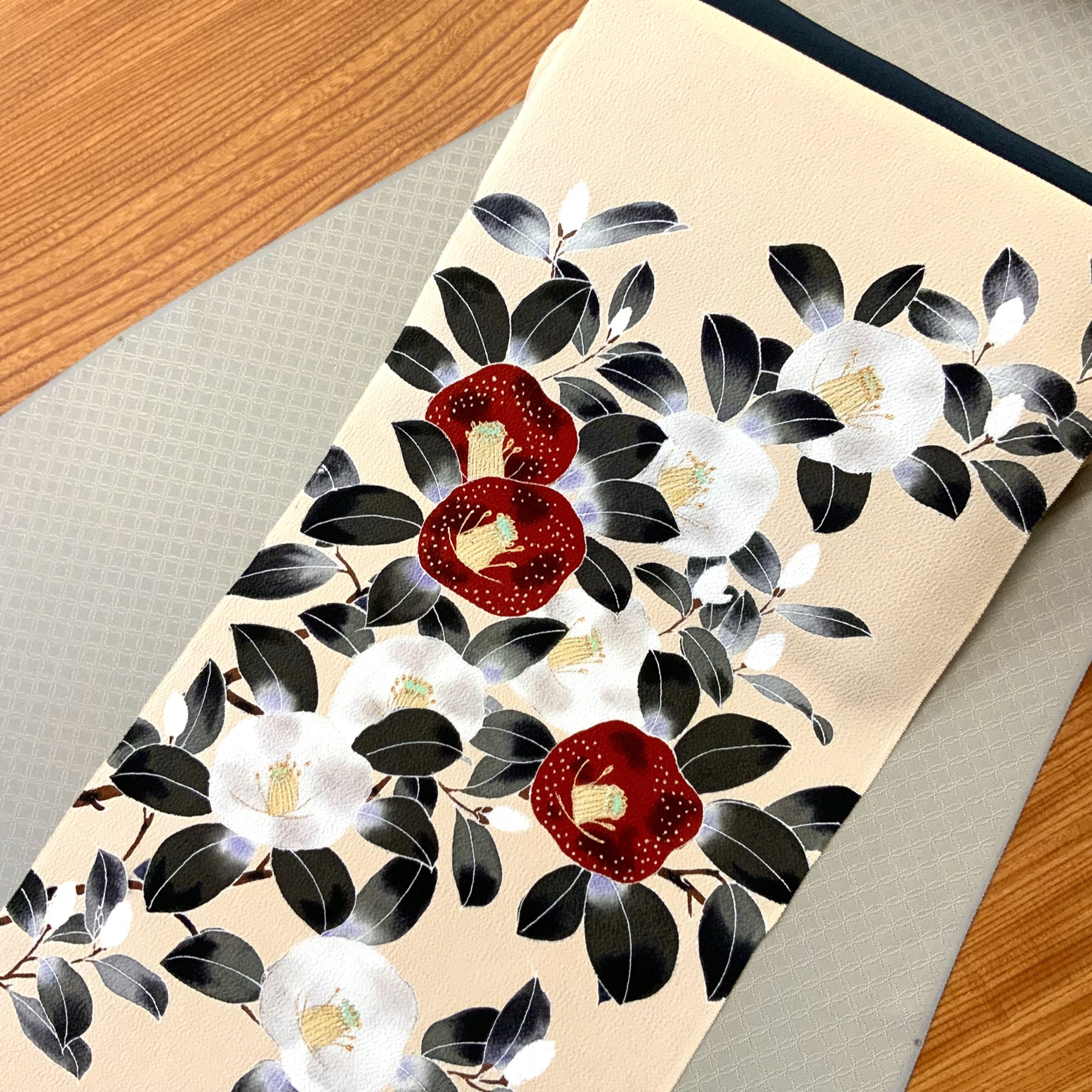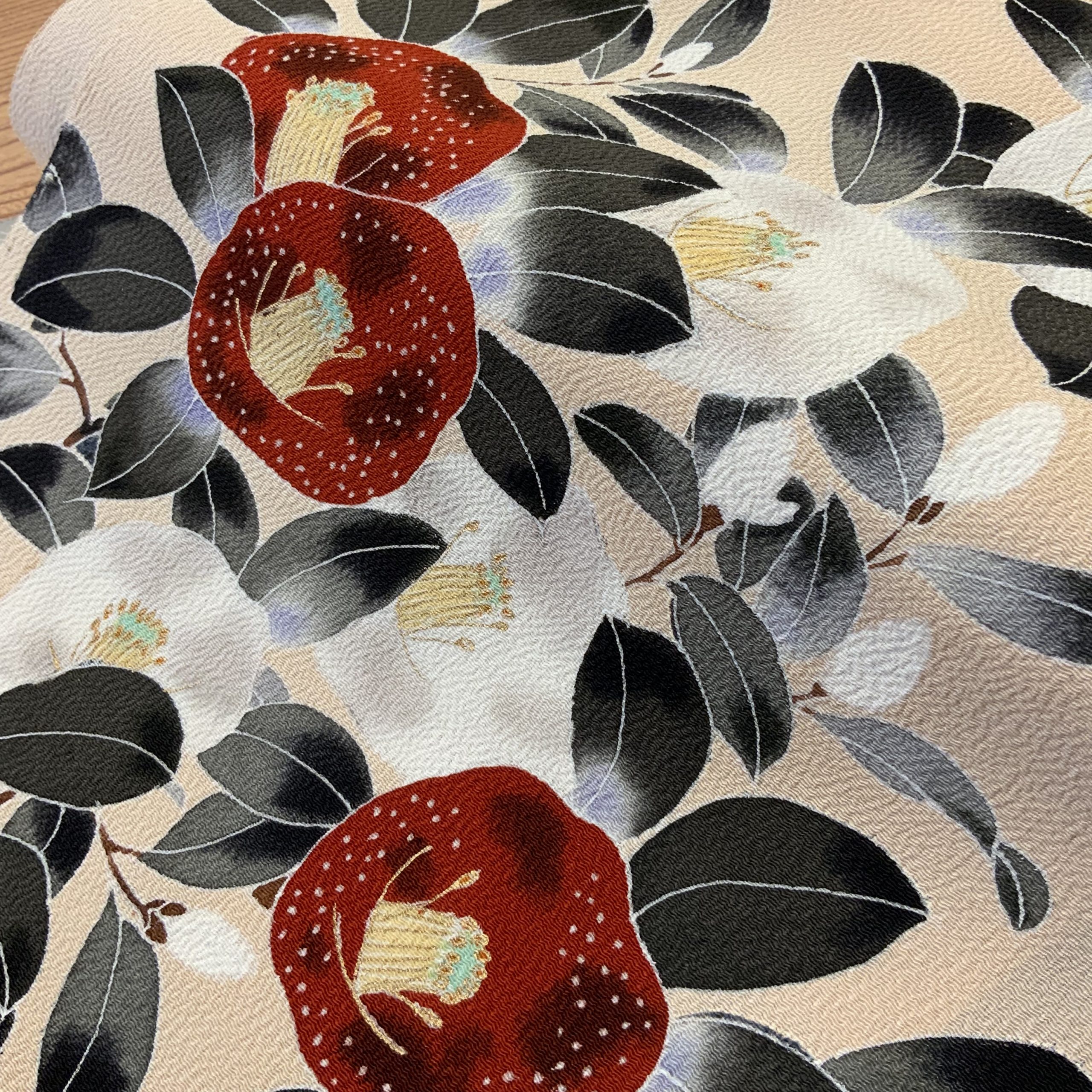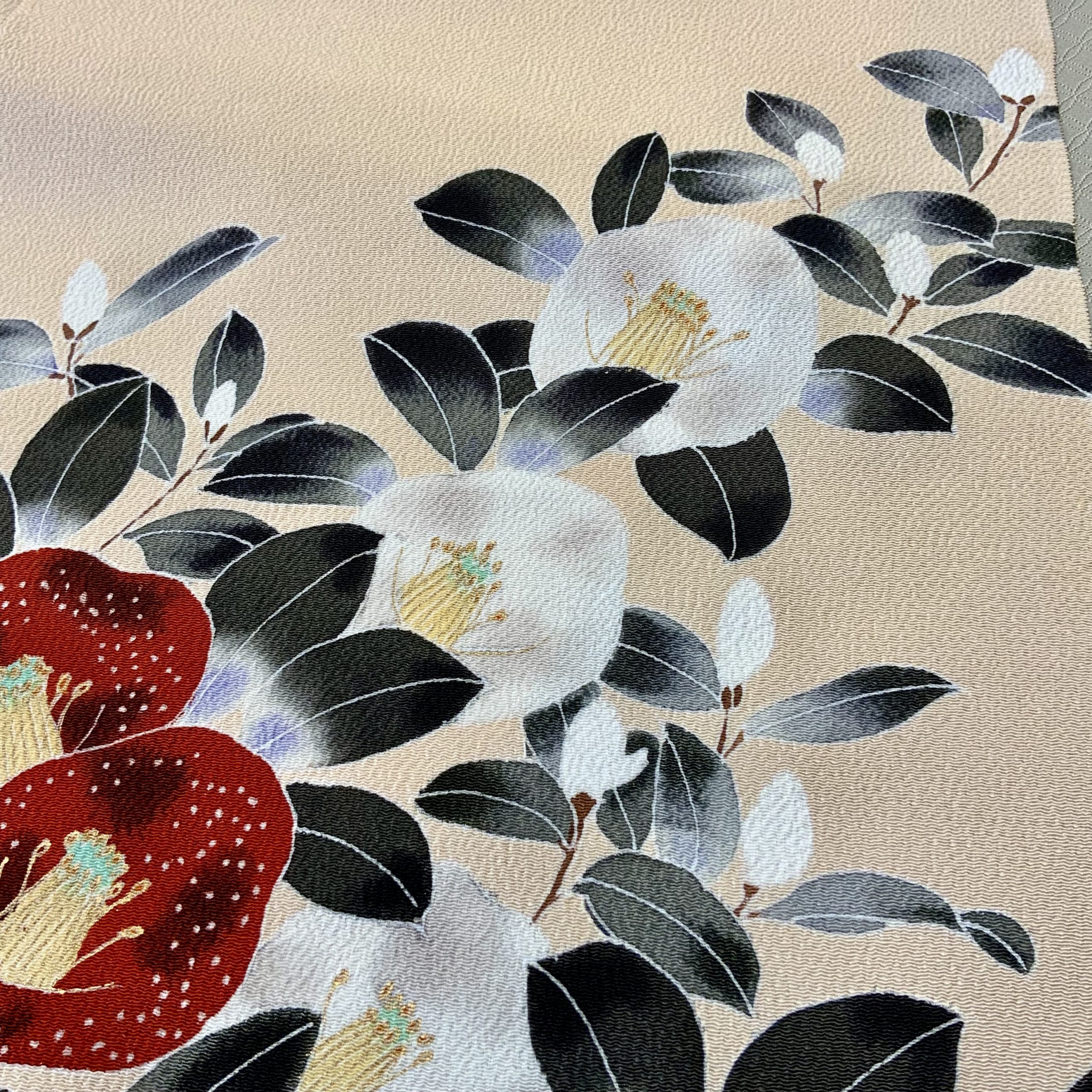 帯:砥の粉色の地に、手描きの白椿・赤椿が映える染名古屋帯。季節を問わず装いに華を添えます。
