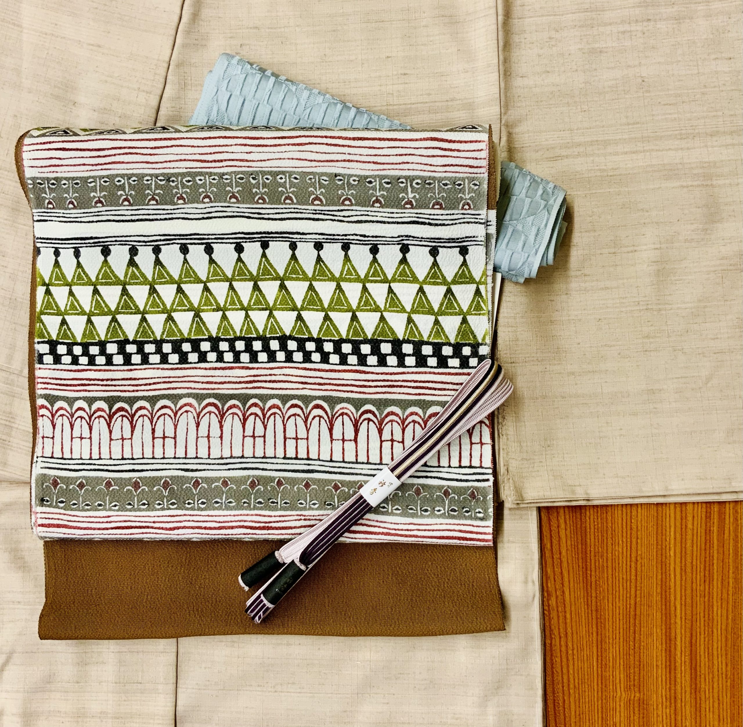 ・ちりめん名古屋帯の段更紗文様が装いの主役に
