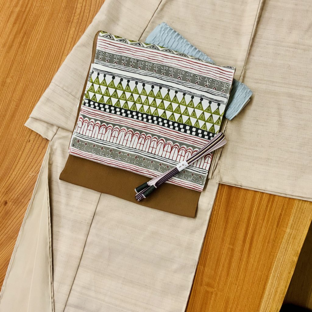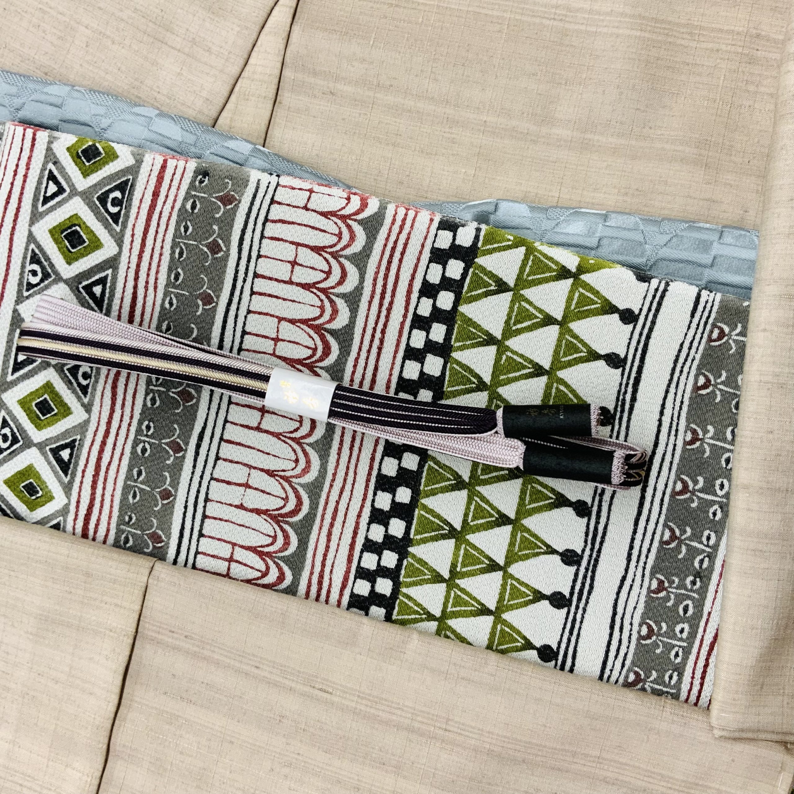 合わせた名古屋帯は、ちりめん地に段更紗文様を配した一本。異国情緒を感じさせる更紗柄を段ごとに構成することで、装いにリズムと遊び心を添えています。紬の素朴さと、染め帯ならではの表情が響き合い、大人の普段着物として完成度の高いコーディネートです。