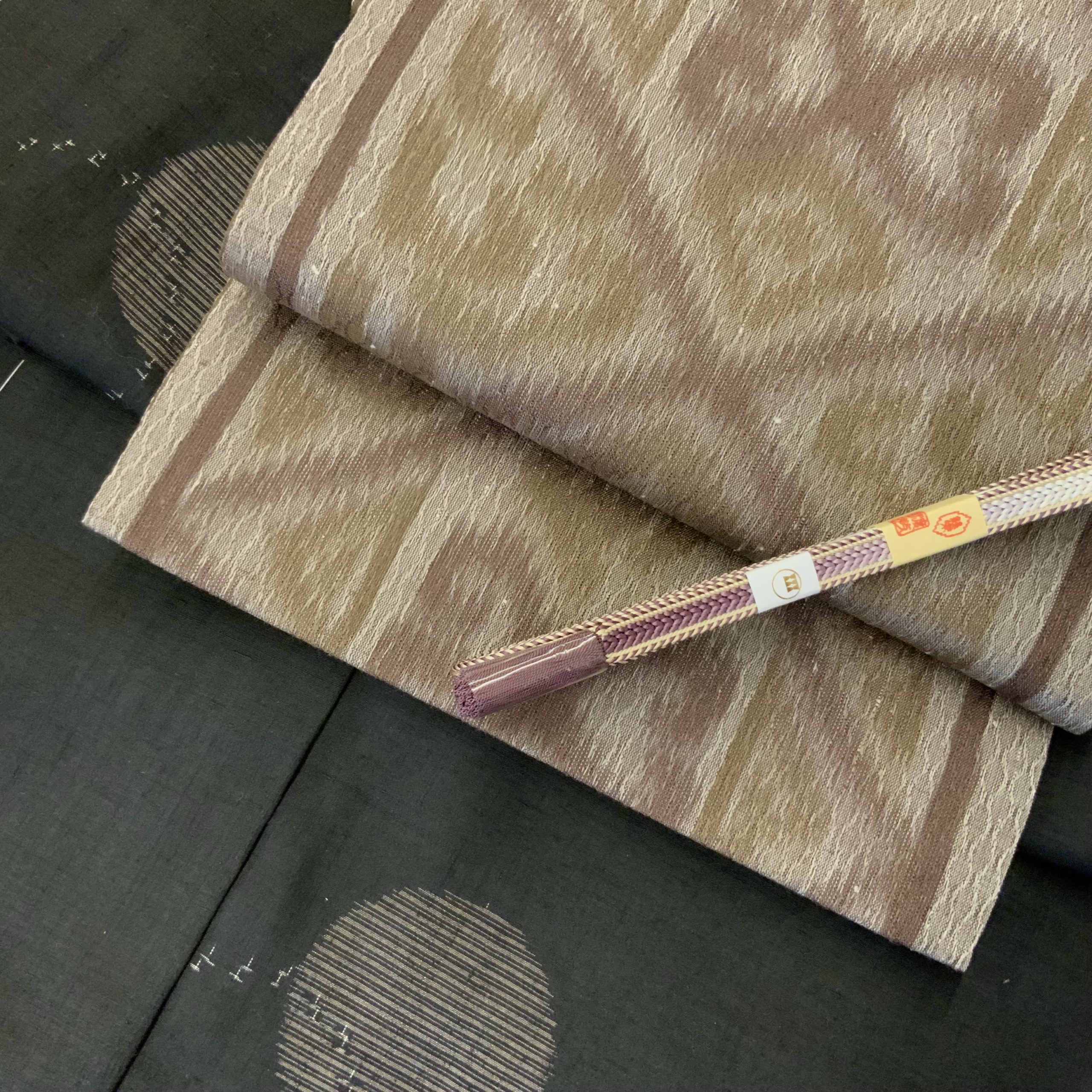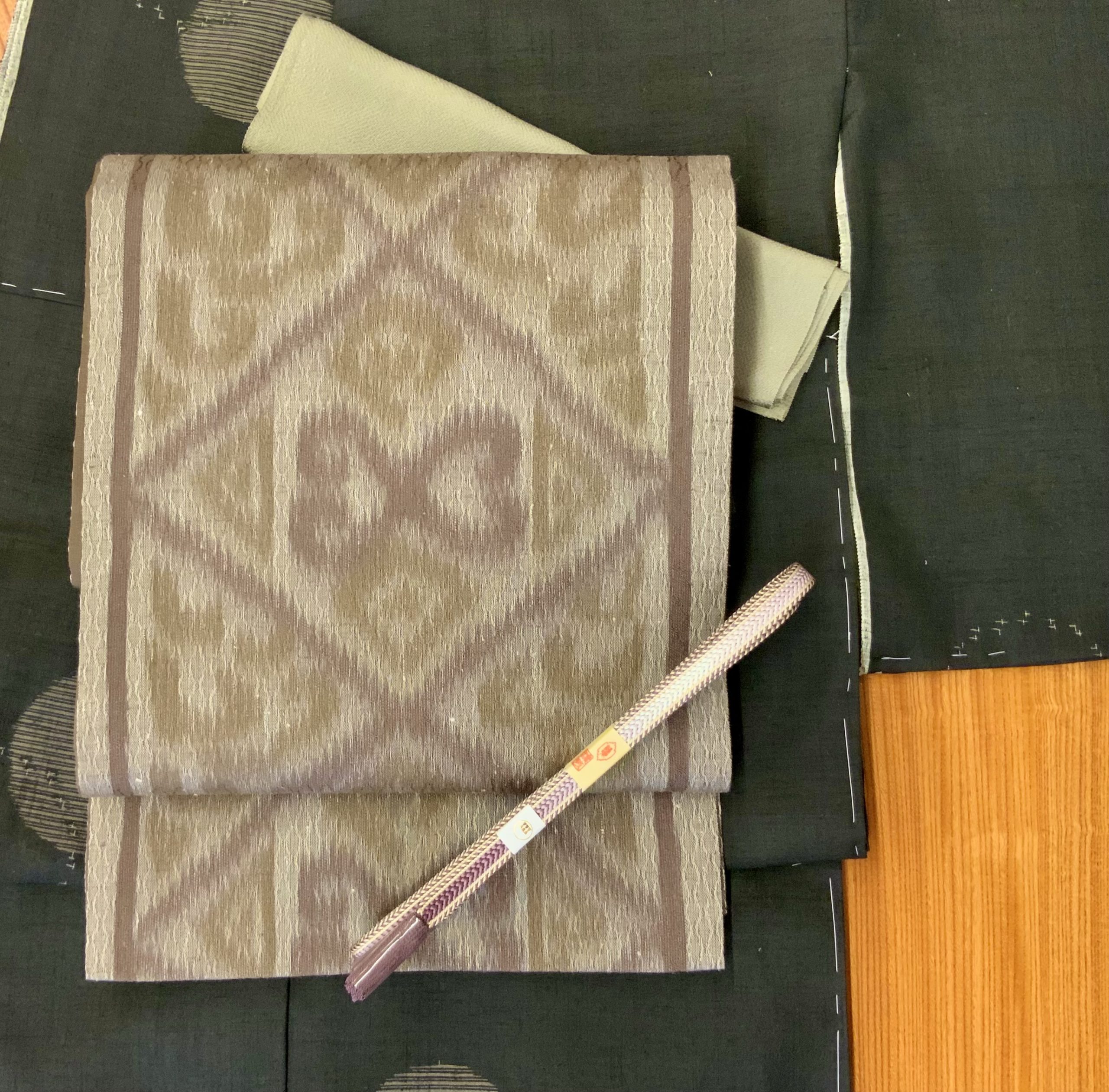 合わせた袋帯は、潤み色を基調に、上代絣の技法で古代草華コプト柄を表現したもの。古代文様の趣と絣の揺らぎが、結城紬の素朴さと呼応し、知的で深みのある装いに仕上がります。着物を知る方にこそおすすめしたい、本格派の組み合わせです。