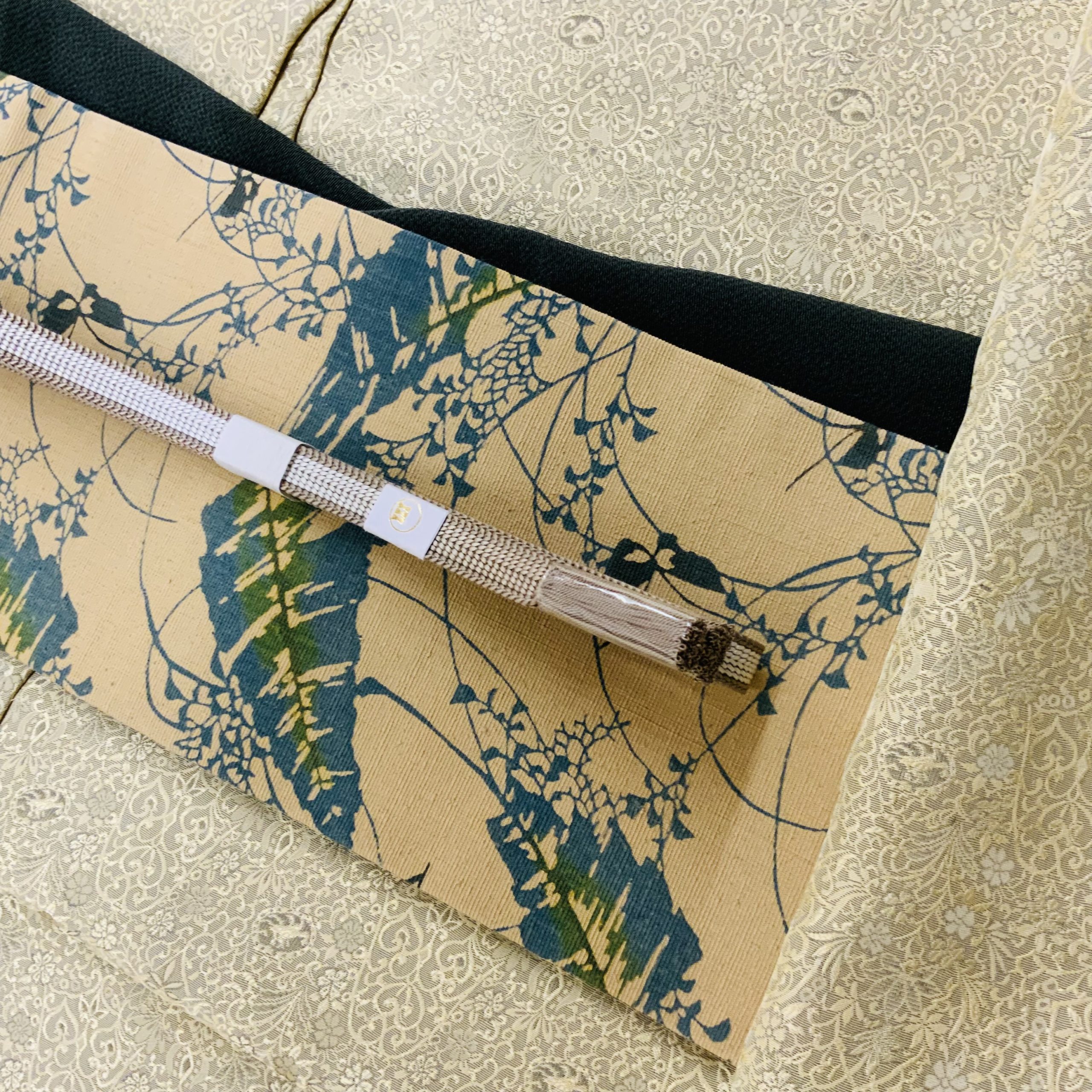合わせるのは、松原与七氏による本藍染・弁柄色地の染名古屋帯。芭蕉の葉に舞う蝶を題材とした意匠は、民藝的な力強さと詩情を併せ持ち、装いに物語を添えてくれます。
