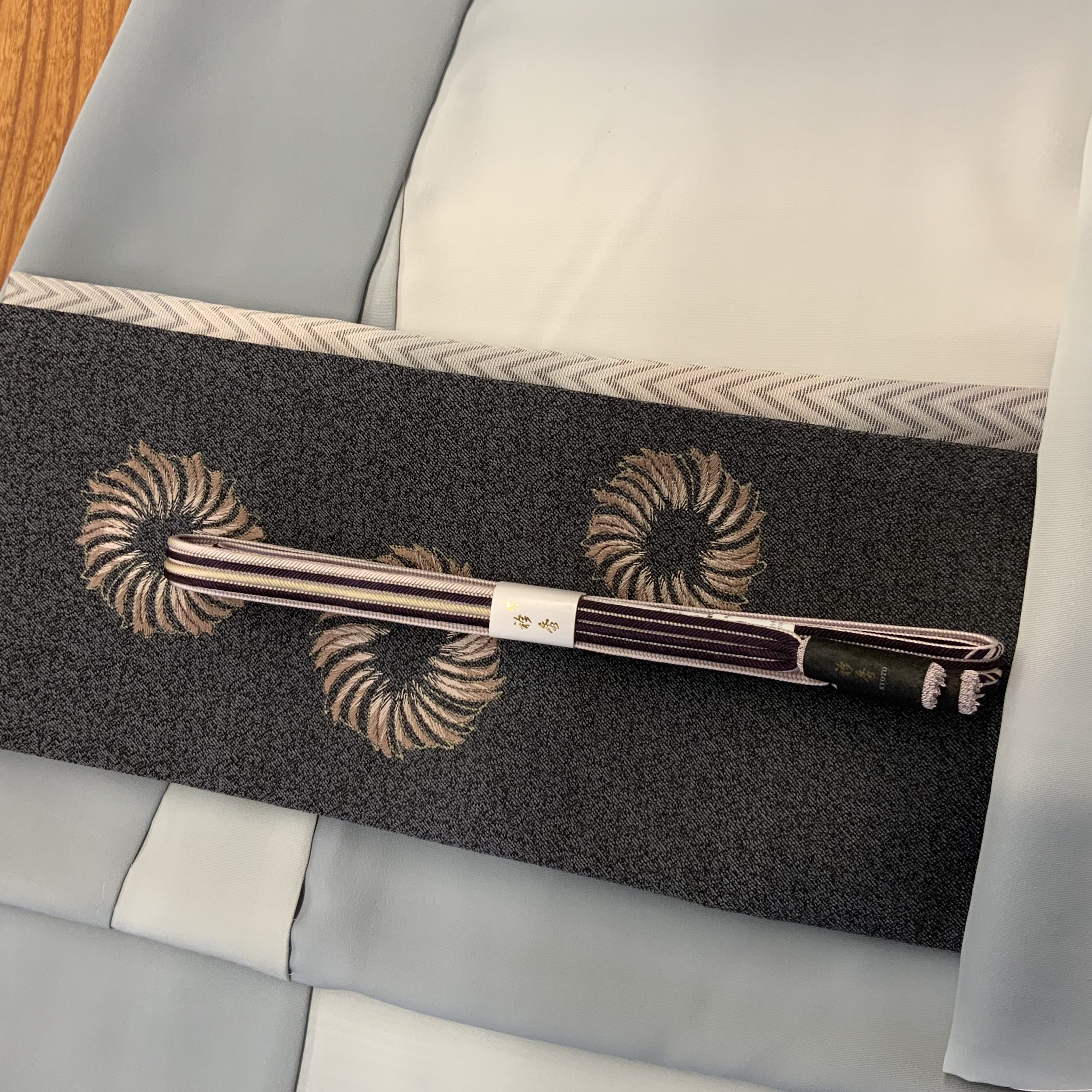 合わせた名古屋帯は、黒地に金糸で木目文様を表し、その中に花車を配した意匠。抽象性と伝統文様が調和し、落ち着きの中にさりげない華やぎを添えます。品よく引き締まったコーディネートは、街歩きから観劇、食事会まで幅広く活躍します。