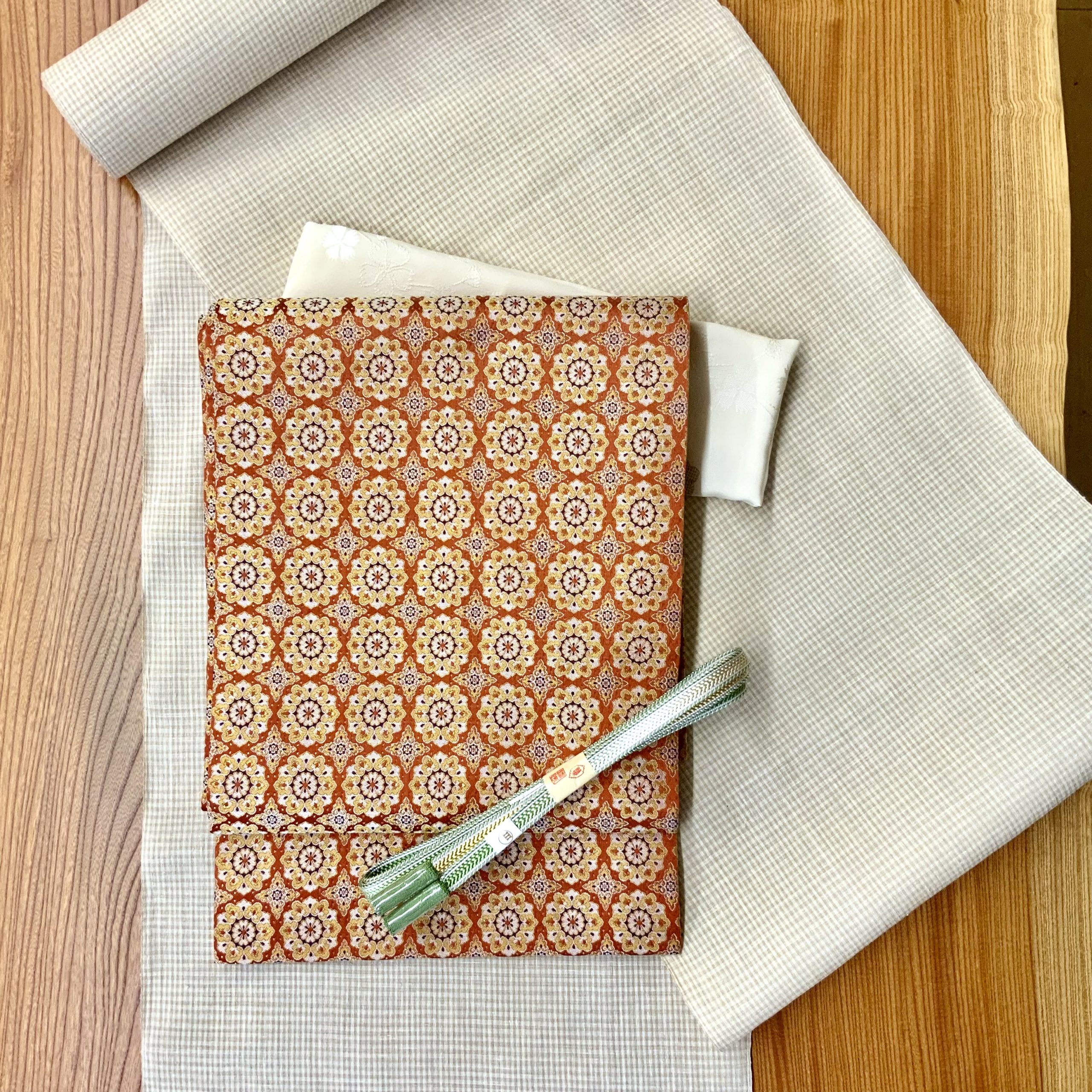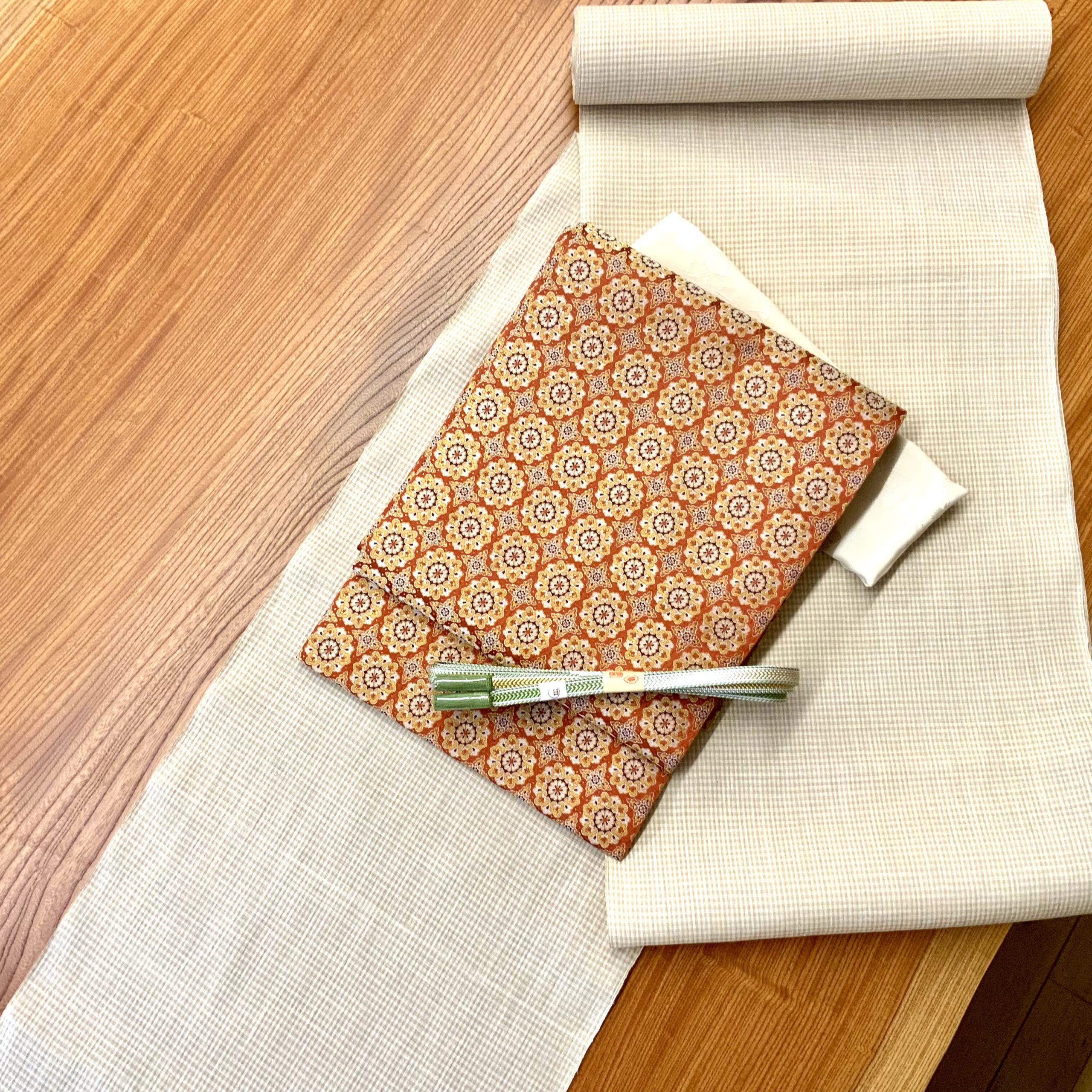 本場結城縮/結城紬 夏/結城縮 小格子/砥の粉色 着物/夏紬 高級/単衣着物 コーデ/西陣織 名古屋帯/経錦/正倉院文様 帯/緋色帯/古典柄 帯/銀座 着物/大人の着物コーデ